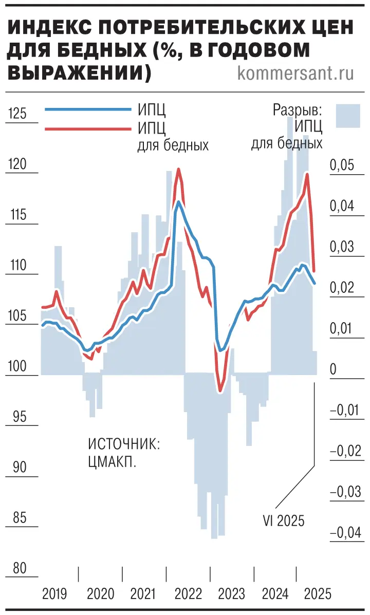 В последнем обзоре макроэкономических тенденций эксперты Центра макроэкономического анализа и краткосрочного прогнозирования (ЦМАКП) сообщают о существенном замедлении роста стоимости "корзины малообеспеченных" в июне 2025 года. Годовые темпы инфляции для этой группы, включающей базовые продукты питания (без масла, алкоголя), лекарства, бытовую химию, ЖКХ и транспорт, снизились до 10,5%. Это заметно ближе к общему уровню потребительской инфляции в 9,4%, демонстрируя положительную тенденцию.