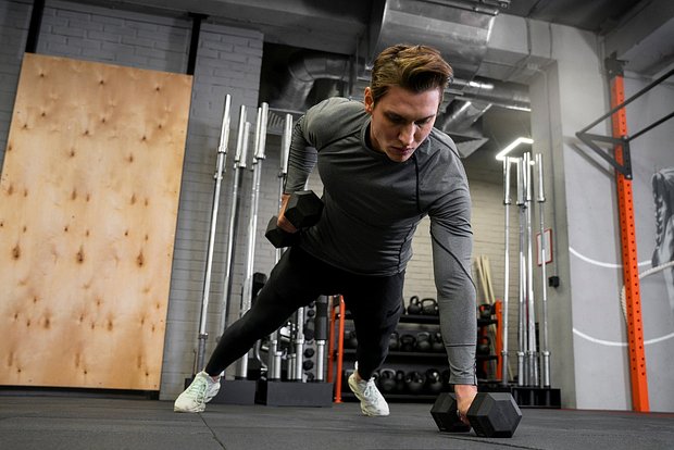 Завершающее упражнение представляет собой усложненный вариант классической планки. Примите положение высокой планки, опираясь одной рукой на гантель. Выполните отжимание, затем вернитесь в исходное положение и подтяните гантель к спине. Это комплексное движение задействует мышцы всего тела и особенно эффективно для укрепления верхней части корпуса.