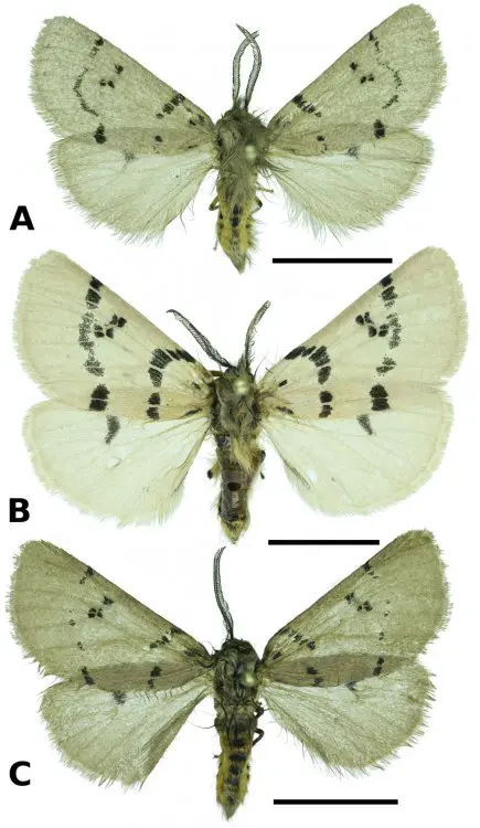 Иллюстрация: A – известный вид Eudiaphora turensis, B – вновь открытый подвид Eudiaphora nozimdjoni, C – новый вид Eudiaphora tienshanensis. © Vitaly M. Spitsyn et al.